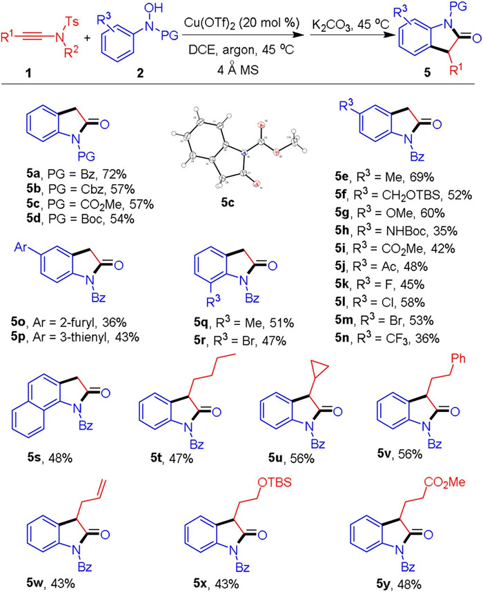 Considering that the moiety of N-tosyl of amides 3 and 4 could act as leaving group in intramolecular cyclization, we envisioned that treatment of 3 and 4 with base might enable a lactamization. Upon completion of the Cu(OTf)2-catalyzed oxoarylation of ynamide 1a and hydroxamic acid 2a, we treated the reaction solution with K2CO3 at 45 ℃. To our delight, we indeed found the consumption of (ortho-aminoaryl)amides and a new product 5a was isolated in 72% yield. The standard analysis showed that 5a was an oxindole compound. We next investigated the scope of this oxoarylation/lactamization process in a one-pot manner. As shown in Scheme 3, a variety of ynamides and hydroxamic acids were subject to this reaction. Besides benzoyl groups, differential protecting groups of hydroxamic acids including Cbz, ester and Boc, were all amenable to this process to deliver the N-protected oxindoles in good yields (5b-5d). The structure of 5c was confirmed by X-ray analysis (CCDC: 2021773). The para-substitutions of hydroxamic acids with methyl, hydroxymethyl, methoxy, amino, ester, ketone, fluoro, chloro, bromo, trifluoromethyl, furan, thiophene, were well tolerated in this one-pot process (5e-5p). Moreover, this process could also produce the 7-substituted and naphthalene-containing oxindoles in moderate yields (5q-5s), which were difficult to be synthesized in conventional methods. Meanwhile, when the internal ynamides were used, this process could deliver the corresponding oxindole products (5t-5y) rapidly. Considering the wealth of oxindoles in medicinal chemistry [15, 16], this method provides a direct approach to these molecules in an efficient way.