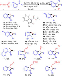 | Scheme 3. Scope of oxoarylation/lactamization. Reaction conditions: 1 (0.2 mmol), 2 (0.3 mmol), 4 Å MS (50 mg), Cu(OTf)2 (20 mol%), DCE (2 mL), 45 ℃, argon, 2 h, then K2CO3 (0.4 mmol), 45 ℃, 2 h. Yields refer to isolated products. | |