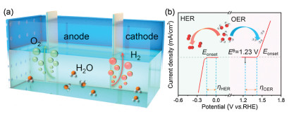 | Fig. 1. (a) Hydrogen evolution reaction (HER) and oxygen evolution reaction (OER) of electrocatalytic water splitting and (b) Schematic representation of HER and OER overpotentials. | |