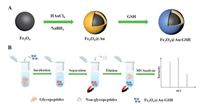 | Fig. 3. (A) Synthetic route of Fe3O4@Au-GSH. (B) Workflow of glycopeptides enrichment by Fe3O4@Au-GSH. Reproduced with permission [44]. Copyright 2019, Elsevier Ltd. | |