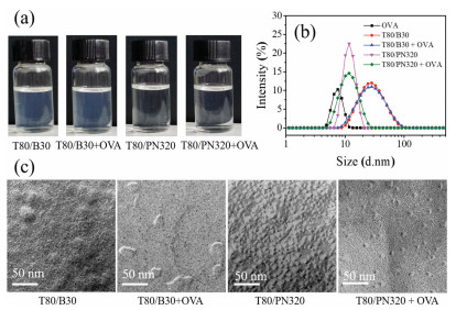 After the model antigen ovalbumin (OVA) was formulated with T80/B30 (12:5) and T80/PN320 (3:5) systems, the appearance of the solution changed little (Fig. 1a). OVA might exist in the palisade layer of the mixed micelle and the small cistern of the vesicle. The average particle size of the mixed micelle system increased slightly despite the PDI magnified distinctly, and the average particle size and PDI of the vesicle system did not change significantly (Fig. 1b). The microstructure of T80/B30 (12:5) vesicles and T80/PN320 (3:5) mixed micelles remained stable after adding OVA (Fig. 1c).