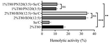 | Fig. 2. Hemolytic activities of T80/B30 vesicles and T80/PN320 mixed micelles with Se/C at 37 ℃. The data were expressed as mean±SD (n=3). ***P < 0.001, **P < 0.01, ns no significant difference. | |