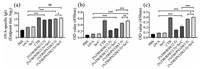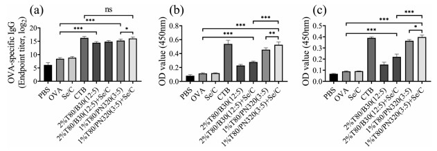 | Fig. 3. OVA specific serum IgG and mucosal sIgA antibody levels synergistically induced by T80/B30 and T80/PN320 with Se/C: (a) OVA specific serum IgG antibody titer; (b) OVA specific sIgA level in nasal cavity; (c) OVA specific sIgA level in lung. The data were expressed as mean±SD (n=5). ***P < 0.001, **P < 0.01, *P < 0.05. | |