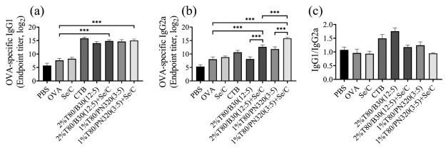 | Fig. 4. The antibody titers of OVA specific serum IgG1 and IgG2a synergistically induced by T80/B30 and T80/PN320 with Se/C: (a) IgG1; (b) IgG2a; (c) IgG1/ IgG2a. The data were expressed as mean±SD (n=5). ***P < 0.001, **P < 0.01, *P < 0.05. | |