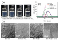 | Fig. 1. Physicochemical characterizations of vesicles of T80/B30 and mixed micelles of T80/PN320: (a) Photographs of the appearance; (b) Particle size distribution (PSD); (c) Images of Freeze-fracture TEM (FF-TEM). The weight ratios of T80/B30 and T80/PN320 were 12:5 and 3:5, and their total concentrations were 2 wt% and 1 wt% respectively. All solutions were in 0.01 mol/L PBS. | |