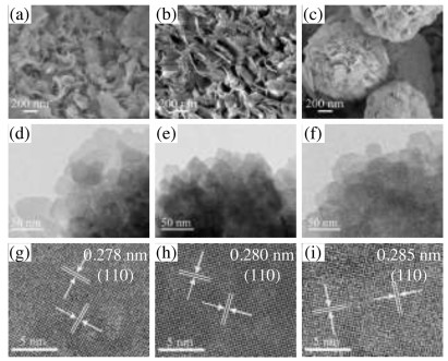 | Fig. 2. SEM, TEM, and HRTEM images of BB (a, d, g), BBI-0.85 (b, e, h), and BI (c, f, i) catalysts, respectively. | |