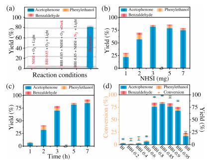 | Fig. 3. (a) Photocatalytic oxidation of ethylbenzene over different reaction conditions. (b) Dependences of oxidation products yield on the NHSI concentration in the ethylbenzene oxidation over BBI-0.85 catalyst. (c) Time-dependence of oxidation products yield over BBI-0.85. (d) Photocatalytic oxidation of ethylbenzene over diverse catalysts. Conditions: 10 mg of catalyst, 0.1 mmol of ethylbenzene, 3 mg of NHSI, 3.0 mL of CH3CN, O2 at 1 atm, room temperature, blue LED light (455 nm, 8 W), 5 h. | |