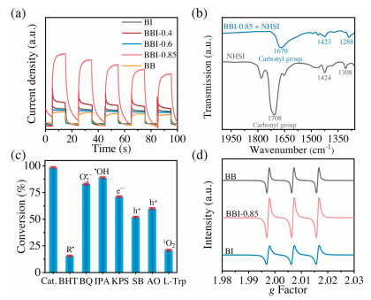 | Fig. 4. (a) Photocurrent-time curves. (b) FT-IR spectra of NHSI and adsorbed NHSI on BBI-0.85 catalyst. (c) Ethylbenzene conversions over BBI-0.85 catalyst with different scavengers. (d) EPR spectra of 1O2 over different catalysts in the presence of TEMP. | |