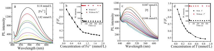 | Fig. 2. (a) The PL spectra of PO QDs suspension vs. varying Fe3+ concentrations. (b) The relationship between F/F0 and increasing Fe3+ concentration in (a) (the inset represents the PL response time of PO QDs suspension toward Fe3+ (1.2 mmol/L) at pH 6.0). (c) The corresponding PL spectra of Ag+-mediated PO QDs suspension vs. varying I− concentrations. (d) The relationship between F/F0 and I− concentration in the presence of increasing I− content (the inset represents the PL response time of Ag+-mediated PO QDs suspension toward I− (0.8 mmol/L) at pH 6.0). | |
