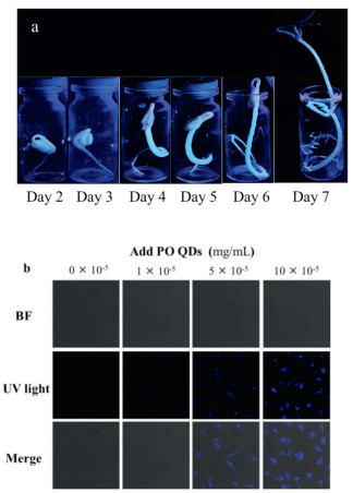 | Fig. 3. (a) Fluorescence images of bean sprouts cultured by PO QDs during the period of growth. (b) Fluorescence microscopic images under bright field (BF), UV light, and merged images of Hela cells incubated with PO QDs (1×10−5, 5×10−5, and 10×10-5 mg/mL) for 0.5 h. | |