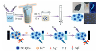 Herein, we reported the synthesis and fluorescence application of a novel phosphorus containing nanoparticle i.e., phosphorus oxide quantum dots (PO QDs) as emissive material. PO QDs with blue-green emission were obtained from the common solvothermal method by using phosphorus pentaoxide (P2O5) as starting material and purified by column chromatography. The resulting emissive PO QDs exhibited the excellent water solubility and stable emission feature in a wide pH range and in high ionic strength solution. Interestingly, PO QDs could response positively to iron ions (Fe3+) and iodine ion (I−) in different response modes (Scheme 1). The photoluminescence (PL) of PO QDs could be directly quenched by Fe3+. While the detection of I− was realized by means of Ag+-mediated PO QDs system via PL quenching. More importantly, the low toxicity of PO QDs demonstrated in bean sprout indicated that this novel PO QDs nanomaterial could be utilized in bioimaging or medicinal diagnostics. Furthermore, PO QDs could also be utilized in luminescent composite film for various promising applications.