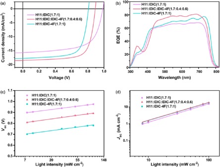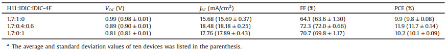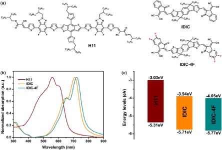 | Fig. 1. (a) The chemical structure of H11, IDIC and IDIC-4F. (b) Normalized absorption of H11, IDIC and IDIC-4F in neat films. (c) Energy level diagram of H11, IDIC and IDIC-4F. | |
