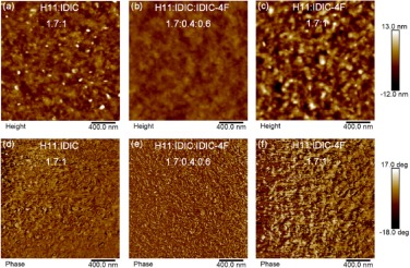 | Fig. 3. (a-c) AFM height images and (d-f) AFM phase images of the binary and the optimized ternary ASM-OSCs. | |
