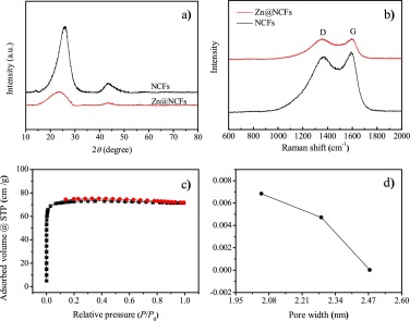 | Fig. 2. (a) XRD patterns of Zn@NCF and NCFs. (b) Raman spectra of NCFs and Zn@NCFs. (c) N2 physisorption isotherms and (d) pore-size distribution curve of Zn@NCFs. | |