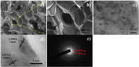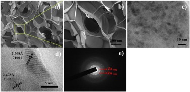 | Fig. 4. (a, b) SEM micrographs, (c, d) HRTEM images and (e) selected area electron diffraction (SAED) pattern of Zn@NCFs. | |