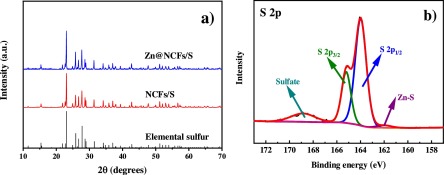| Fig. 5. (a) XRD patterns of NCFs/S and Zn@NCFs/S cathodes and (b) S 2p XPS spectra of Zn@NCFs/S. | |