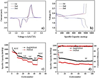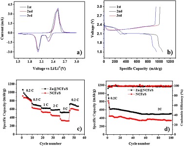 | Fig. 6. (a) Cyclic voltammetry (CV) curves of the Zn@NCFs/S between 1.5 C and 3.0V at 0.1 mV/s. (b) Initial three charge/discharge curves of the Zn@NCFs/S during charge/discharge process (0.2 C). (c) Rate capability test results of Zn@NCFs/S and NCFs/S batteries. (d) Cycle behaviors at 2 C of Zn@NCFs/S and NCFs/S cathodes (1 C = 1675 mA/g). | |