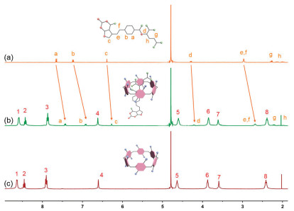 | Fig. 2. 1H NMR spectra (400 MHz, 298 K) of (a) PMX (2.0 mmol/L), (b) PMX (2.0 mmol/L) + WP6A (2.0 mmol/L) and (c) WP6A (2.0 mmol/L) in the 20 mmol/L phosphate buffer solution (pD 7.4). | |