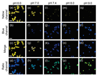Hydronium ion plays critical roles in many biological [1-3] and pathological processes [4-7]. Generally, the pH of normal tissue is carefully maintained at 7.2-7.4 [8], while abnormal changes in the pH gradient can be observed under pathological conditions, including cancer [9-11], sepsis [12], hyperkalemia [13], and chronic kidney disease [14]. For example, a lower pH (6.7~7.1) is always found in tumor microenvironment. And these specific pH gradients in pathological tissues can be used as biomarkers for targeted therapy [15-19]. Furthermore, the imbalance of pH is also considered to be the cause of a variety of secondary diseases [4, 20]. Acidosis, for instance, is an important component of the pathogenetic events that lead to ischemic brain damage [21]. Therefore, monitoring changes in intracellular pH is very important to understand these pH-dependent cellular behaviors and pathological processes. Although many methods for measuring intracellular pH such as microelectrodes [22], NMR [23], and absorbance spectroscopy [24] have been developed, but they suffer from several drawbacks such as low sensitivity, poor selectivity, complicated sampling process, and high cost [25]. By contrast, fluorescence spectroscopy exhibited the advantages of high sensitivity, ease-to-use and capability of visualizing the temporal and spatial changes of intracellular pH [26-28]. However, the traditional fluorescent sensors operating on the fluorescent intensity may be significantly affected by the environmental factors, including changes of optical path length, varied emission collection efficiencies, and altered excitation intensities. Ratiometric fluorescence probes or sensors work on the changes of two individual emission bands, by which they can efficiently self-calibrate to exclude the interference from the environment [29-31]. Nevertheless, the delicate difference in wavelength and serious crosstalk between emission bands still limits their effectiveness and resolution [32, 33]. Therefore, it is still of significance to develop renewed ratiometric pH fluorescent sensors with optimized signals.
