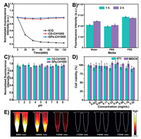 | Fig. 2. The in vitro NIR-II fluorescence property and stability of GPs-CH1055 and CD-CH1055. (A) Photo-stability study of GPs-CH1055 and CD-CH1055 in aqueous solution (ICG as reference, under continuous 808 nm laser (180 mW/cm2) irradiation for 120 min). (B) The fluorescence intensity values of GPs-CH1055 in aqueous solution, PBS and FBS after 1 h and 2 h incubation. (C) pH-Stability study of GPs-CH1055 and CD-CH1055 at different pH buffers, the fluorescence intensity was measured after 10 min, 1 h, 24 h incubation. (D) Cell viability of 4T1 and MDCK cells after incubation with different concentrations of the GPs-CH1055 NPs for 24 h (n = 3). (E) NIR-II images of GPs-CH1055 (left) and CD-CH1055 (right) NPs in aqueous solution with different LP filters (LP880, LP1000, LP1250, LP1320, LP1550 from left to right, exposure time: 30 ms). | |