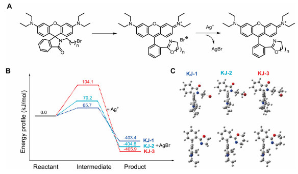 As for the response mechanism, we proposed that probe KJ-1 would be converted to be rhodamine derivative with oxazoline structure after the binding of Ag+ to the bromine, which promotes the spirolactam ring opening and the production of oxazoline Rh-O, which was verified by the high resolution electrospray ionization mass spectra (HRMS, Fig. S12 in Supporting information). We also studied the spectroscopic difference with rhodamine B (RD-B). The maximum absorption peak of Ag+ added KJ-1 solution is very near to that of the RD-B solution (Fig. S13A in Supporting information). However, there is a noticeable fluorescence emission difference between them. The emission peak locates at 575 nm, where there is a 5 nm decrease compared to that of the product Rh-O after probe KJ-1 reaction, further suggesting that the product is not RD-B (Fig. S13B in Supporting information). To further understand the reaction mechanism and the difference of three probes in response to silver ion, DFT calculations were performed. As shown in Fig. 2A, it is proposed that two elementary reactions are involved in the response mechanism. In the first elementary reaction, a SN2 substitution reaction takes place first to form the cyclized structure and the bromine atom is transformed to the negative bromide ion, which forms a transient intermediate with no charge. Then, the silver ion binds with negative bromide ion to produce AgBr precipitate in the secondary reaction, and such a precipitation greatly promotes the whole forward reaction. The energy differences between reactant, intermediate and product for KJ-1, KJ-2 and KJ-3 were calculated with DFT calculations. Fig. 2B shows that the all the energy gaps are positive for the first step, suggesting these reactions are unflavored thermodynamically. All calculated values for the second step of three probes are negative and no much difference exists among them, indicating that the second reaction is much favored thermodynamically and the precipitation reaction plays a key role to promote the whole reaction. But the energy gap for KJ-1 is the lowest in the first step among these three probes, clearly indicating that the reaction starting from KJ-1 is more favorable than that of the others because the first step is the rate-determining step, which sufficiently supports the experimental observations that all three probes can respond to Ag+ but only KJ-1 has the best response to silver ion. The optimized structures of reactants and products for KJ-1, KJ-2 and KJ-3 are shown in Fig. 2C, where it is clearly observed that a cyclization reaction occurs accompanying the change of bromine to bromide ion during the substitution reaction. These conclusions are also consistent with common knowledge that the formation of five-member ring is most favorable thermodynamically, and well supports our experimental observations.