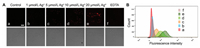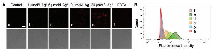 | Fig. 3. (A) Laser confocal fluorescence microscopic images of BEL-7402 cells under different conditons. (a) Only KJ-1 (10 μmol/L) 30 min treatment; (b-e) Pretreatment with 1 μmol/L, 5 μmol/L, 10 μmol/L and 20 μmol/L Ag+ respectively for 30 min, then cultured with KJ-1 (10 μmol/L) contained medium for 30 min; (f) Pretreatment with 20 μmol/L Ag+ first for 30 min, then 20 μmol/L EDTA was added prior to the KJ-1 (10 μmol/L) culture for 30 min. The directly below the dark field are corresponding DIC images; scale bar: 30 μm; λex = 560 nm, λem = 570–650 nm. (B) Flow cytometric analysis of above respective cells. | |