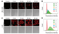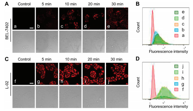 | Fig. 4. Comparation of confocal fluorescence microscopic images between BEL-7402 cells and L-02 cells under different treatment time of Ag+. (A) BEL-7402 cells were treated with medium containing probe (10 μmol/L) for 30 min, then AgNO3 solution (10 μmol/L) at 37 ℃ for 5 min, 10 min, 20 min, and 30 min repectively before imaging. (C) L-02 cells were treated as those in (A). The directly below the dark field are corresponding DIC images; scale bar: 30 μm; λex = 560 nm, λem = 570–650 nm. (B) and (D) are corresponding flow cytometric analysis data of (A) and (C) respectively. | |