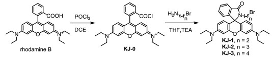 As shown in Scheme 1, to prepare the desired compounds, rhodamine B acyl chloride intermediate KJ-0 was synthesized first and then reacted with bromoalkylamine of different carbon chain lengths. The resulting probe structure was well characterized by 1H and 13C NMR and high-resolution mass spectra (Figs. S1–S9 in Supporting information), and the formation of probes was demonstrated.