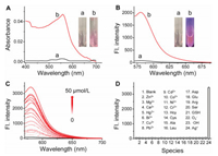 | Fig. 1. (A) Absorption spectra of KJ-1 (10 μmol/L) before (a) and after (b) reaction with Ag+ (20 μmol/L); the inset shows the solution color changes under visible color. (B) Corresponding fluorescence spectra (λex = 558 nm) of (A); the inset herein illustrate the color changes under 365 nm light. (C) Fluorescence spectra of KJ-1 (10 μmol/L) reacting with Ag+ at varied concentrations. (D) Fluorescence responses of KJ-1 (10 μmol/L) to various substances (5 equiv.). The results are the mean ± standard deviation of three separate measurements. λex/em = 558/580 nm. | |