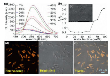 | Fig. 3. (a) Fluorescent spectra of c34. (b) Emission spectra of c34 in H2O/THF solution. (c) SEM image of c34 in H2O/THF (99/1, v/v). (d) Fluorescent image of HeLa cells stained with c34 (20 μmol) for 20 min. (e) The bright-field image of cells. (f) The overlaid image of d and e. | |