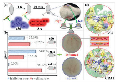 | Fig. 4. (a) The arachidonic acid-induced ear swelling. (b) The activity of c36 against the ear swelling. (c) The binding mode of c36 and CRA1 with CB2. | |