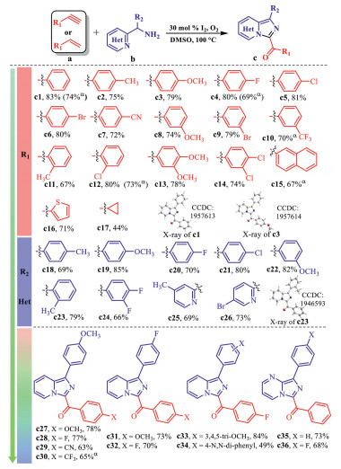 To verify the above hypotheses, an investigation of optimal reaction conditions was conducted using the reaction of phenylacetylene (a1) with phenyl(pyridin-2-yl)methanamine (b1) as the model (Table S1 in Supporting information). At first, the reaction of a1 (0.5 mmol) with b1 (0.5 mmol) was performed in DMSO at 100 ℃ with the addition of 0.5 equiv. of iodine, while only a trace amount of benzoyl-imidazo[1, 5-a]pyridine c1 was detected. Surprisingly, the reaction efficiency was distinctly enhanced when treated with oxidants including K2S2O8, TBHP, DTBP, TBPB, and O2. With the promotion of O2, the mixture smoothly transformed into c1 with a yield of 42%. Considering the alkylation of pyridine with intermediated α-iodo acetophenone of a1 may suppress the desired transformation, different acid was introduced into the system to promote the reaction. As expected, the reaction efficiency was significantly improved and gave 68% yield of c1 in the presence of HCl. With further modulation of the iodine catalyst, solvent and temperature, the reaction achieved a good yield of c1 up to 83% (Table S1, entry 19). Furthermore, it is surprising that the yield of c1 could still reach 74% when phenylacetylene was replaced by styrene.