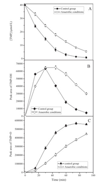 | Fig. 2. Degradation of TMP (A) under control group (■) and anaerobic conditions (⬜). Time-dependent evolution of absorption peaks of TMP−OH (B) and TMP = O (C) in HPLC-DAD, TMP−OH (270 nm) under control group (◆) and anaerobic conditions (◇), TMP = O (293 nm) under control group (▲) and anaerobic conditions (△). ([TMP]0 = 40 μmol/L, [PS]0 = 2 mmol/L, T = 60 ℃, pH 7.0). | |