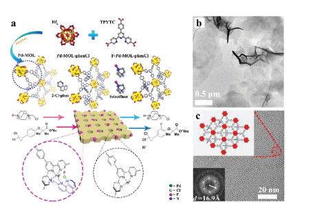 Wang and Lin et al. constructed Pd-MOL-phenCl catalyst for the fluoridation of aromatic hydrocarbons [89]. A terpyridine (TPY)-based ligand on the MONs, together with a 2-chloro-110-phenanthroline (phenCl) as a co-ligand, chelates with Pd(II) to form the active center (Fig. 11a). The Pd-MON-phenCl was subsequently reacted with 2 equiv. of Selectfluor to obtain F-Pd-MON-phenCl (Figs. 11b and c), which can be used as a solid reagent for C–H fluorination of arenes. Aromatic hydrocarbons with various functional groups including nitrile, hydroxyl, heterocycles, ketones, chlorides and ethers, were converted into the corresponding fluorination products, and the yields were 81% for 4-phenylbenzonitrile, 100% for phenol, 81% for 2-phenylpyridine, 81% for 4-phenylcyclohexanone, 7% for 4, 6-dichloro-2, 5-diphenylpyrimidine and 52% for an aromatic ether. The F-loaded solid reagent retained some activity after storage for even one month (20% yield). The presence of free radical intermediate states of the phenCl ligand is observed during the catalytic fluorination process, and can further react with Selectfluor (1 equiv.) to form (N-(FO)-phenCl·) groups, which could achieve the synergistic catalysis with Pd active center. Pd-MON-phenCl can also be used as catalyst for the fluorination of various arenes by using Selectfluor directly, and the yields are 90% for 4-phenylbenzonitrile, 76% for phenol, 82% for 2-phenylpyridine and 62% for 4-phenylcyclohexanone.
