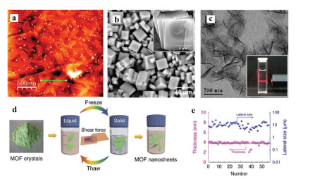 | Fig. 2. (a) AFM topography image of [Cu2Br(IN)2]n MONs deposited on HOPG. Reproduced with permission [31]. Copyright 2010, Royal Society of Chemistry. (b) Scanning electron microscopy (SEM) image of as-synthesized Zn2(bim)4crystals. The inset image shows the typical flake-like morphology of Zn2(bim)4 crystals. (c) Transmission electron microscopy (TEM) image of Zn2(bim)4 MONs. The inset shows the Tyndall effect of a colloidal suspension. Reproduced with permission [29]. Copyright 2014, American Association for the Advancement of Science. (d) The freeze-thaw exfoliation of MAMS-1 crystals into dispersed nanosheets. (e) Thickness and lateral size distribution of exfoliated MAMS-1 nanosheets after 10-cycle freeze-thaw exfoliation in hexane (horizontal line indicates the theoretical thickness of a bilayer MAMS-1 nanosheet). Reproduced with permission [37]. Copyright 2017, Nature Publishing Group. | |