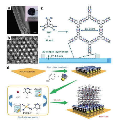 | Fig. 3. (a) SEM image from cross-side view. Scale bar: 1 μm. Inset: photo of a large-area free-standing film. (b) High-resolution TEM (HRTEM) image of the 2D honeycomb structures. Scale bar: 2 nm. Reproduced with permission [44]. Copyright 2018, Nature Publishing Group. (c) Synthesis of a single-layer nanosheet using the Langmuir–Blodgett method at an air/water interface. Reproduced with permission [47]. Copyright 2015, Wiley-VCH. (d) Schematic illustration of the thin-film fabrication of Fe(py)2[Pt(CN)4] based on the LbL protocol. Reproduced with permission [48]. Copyright 2016, Nature Publishing Group. | |