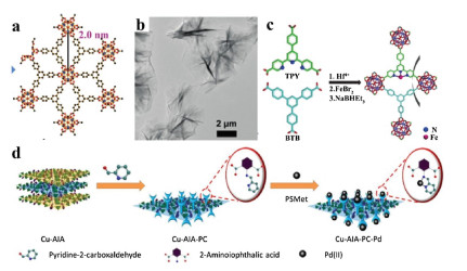 | Fig. 7. (a) Formation of the 2D kgd lattice from 6-connected SBUs and 3-connected BTB ligand. (b) TEM image of Hf6O4(OH)4(HCO2)6(BTB)3 MONs. (c) Preparation of the Fe-TPY-MONs. Reproduced with permission [91]. Copyright 2016, Wiley-VCH. (d) Schematic illustration for the preparation of Cu-AIA-PC-Pd catalyst. Reproduced with permission [90]. Copyright 2020, Wiley-VCH. | |