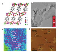| Fig. 6. (a) Crystal structure of NiCo-MONs. (b) TEM image of NiCo-MONs. The inset shows the Tyndall light scattering of NiCo-MONs in an aqueous solution. (c) HAADF-STEM image of the (200) plane for NiCo-MONs showing the hexagonal arrangement of the metal atoms. The pink color represents metal atoms, blue is for light elements (carbon and oxygen), and green is for the background. (d) AFM image of as-prepared NiCo-MONs, showing measured dimensions of individual flakes. Reproduced with permission [69]. Copyright 2016, Nature Publishing Group. | |