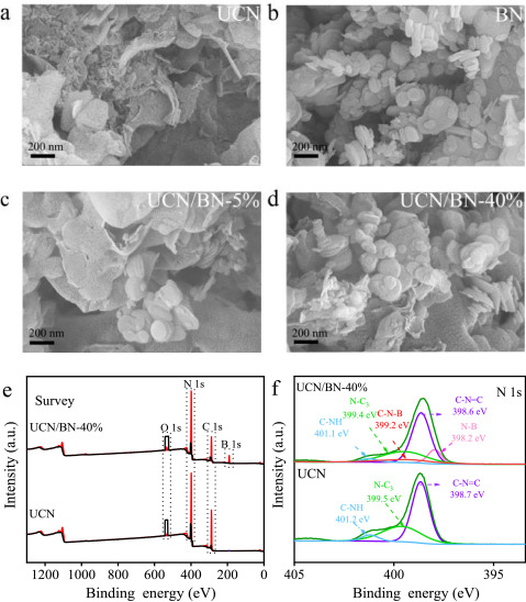 | Fig. 2. The morphology and XPS analysis of UCN/BN. SEM image of (a) UCN, (b) BN, (c) UCN/BN-5% and (d) UCN/BN-40%. (e) Survey XPS spectra. (f) N 1s XPS spectra. | |