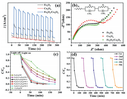 | Fig. 3. (a) Transient photocurrent spectra and (b) EIS spectra of the as-prepared samples. (c) Photocatalytic performance for SMZ degradation on different photocatalysts and (d) recycling experiment of Fe2O3/Co3O4@NF towards SMZ degradation under simulated solar light irradiation. | |