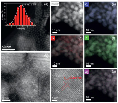 | Fig. 2. Morphology characterizations of Ag/CuFeS2. (a) HAADF-STEM image of Ag/CuFeS2. (b) Aberration-corrected HAADF-STEM image (left) of Ag single atoms (white dots in the circles) on CuFeS2 QD support and magnified HAADF-STEM image (right) of the square marked with red dots. STEM-EDS mapping of element distribution within (c) Ag/CuFeS2; (d) Fe; (e) Cu; (f) S; (g) Ag. | |