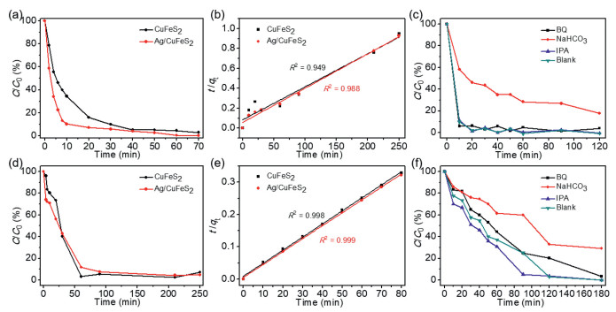 | Fig. 5. Cr(Ⅵ) and RhB removal experimental data. (a) Photocatalytic degradation behaviours of RhB with different catalysts. (b) Pseudo-second-order fitting of RhB degradation. (c) The effects of different scavengers on the degradation of RhB over Ag/CuFeS2. (d) Photocatalytic removal behaviours of Cr(Ⅵ) with different catalysts. (e) Pseudo-second-order fitting of Cr(Ⅵ) removal. (f) Effects of different scavengers on the degradation of Cr(Ⅵ) over Ag/CuFeS2. | |