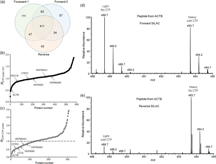 | Fig. 3. SILAC-based competition assay for assessing CTP-binding proteins in human proteome. (a) A Venn diagram showing the overlap of the quantified proteins (RCTP probe 10/1 < 2) from forward and reverse SILAC labeling experiments. (b) The RCTP probe 10/1 ratios of proteins in probe concentration-dependent SILAC experiments. (c) The RCTP/CTP probe ratios of proteins in competitive SILAC experiments with and without free CTP treatment. (d, e) ESI-MS of the light- and heavy-labeled tryptic peptide AGFAGDDAPR from ACTB in the presence or absence of free CTP in forward (d) and reverse (e) SILAC experiments. | |