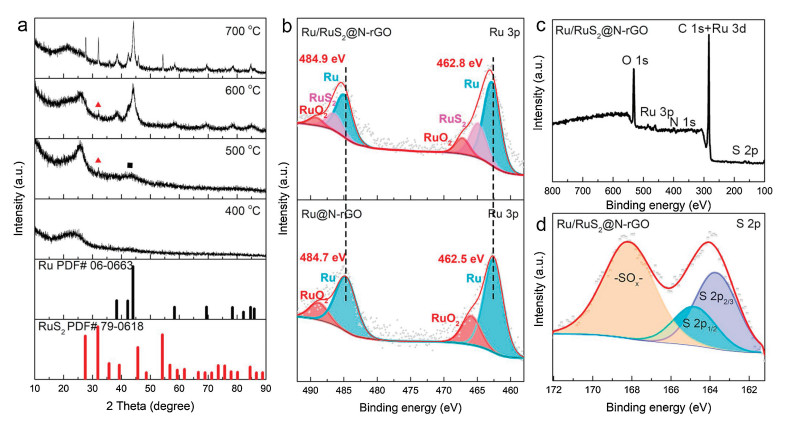 Scheme 1 revealed the synthesis route of Ru/RuS2@N-rGO. First, the aerogels composed of 5 mg RuCl3, 5 mg ppy, 20 mg GO and various quantities Na2SO4 were prepared as intermediate via ultrasonic dispersion and freeze-drying. Subsequently, the aerogels were annealed under an N2 atmosphere at various temperatures (400−700 ℃) to produce Ru/RuS2@N-rGO. For comparison, Ru@N-rGO and Ru/RuS2@N-rGO-x were also prepared as reference samples by adjusting the amount of Na 2SO4 (0 mg, 2.5 mg, 10 mg and 20 mg).