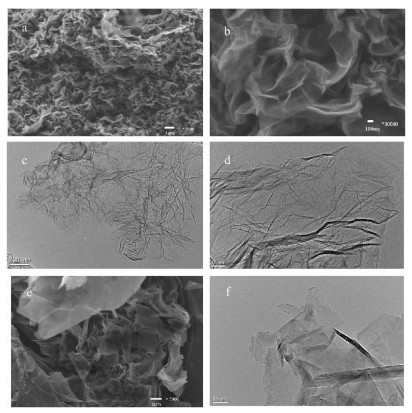 First, the morphology of the sample was characterized by SEM and TEM. Figs. 1a and b show SEM images of HG-160 at low resolution and high resolution, respectively. The results revealed that the sample has multiple layers with many wrinkles. The wrinkle is a characteristic feature of single-layer graphene, which proves that the content of HG-160 in a monolayer structure predominates. Figs. 1c and d show TEM images of HG-160. The TEM images of HG-160 in Figs. 1c and d also confirmed that the sample have a layer-structure. The large size of the hydrogenated graphene (more than 1 μm) gives the material wider potential application prospects. Figs. 1e and f show the SEM and TEM images of HG-100. Compared with HG-160, it shows less wrinkles which indicated that there is reduced monolayer structure within the sample.