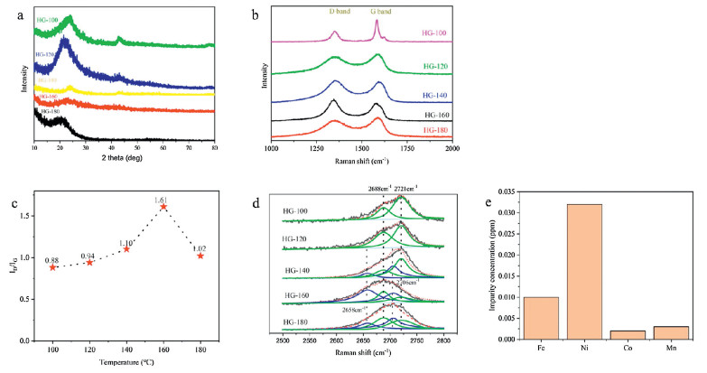 | Fig. 2. (a) XRD results of the samples. (b, c) Raman results and ID/IG values of the samples. (d) The measured 2D Raman band of the samples. (e) Contents of the metal impurities (such as Fe, Ni, Co or Mn) of HG-160 measured via ICP-OES. | |