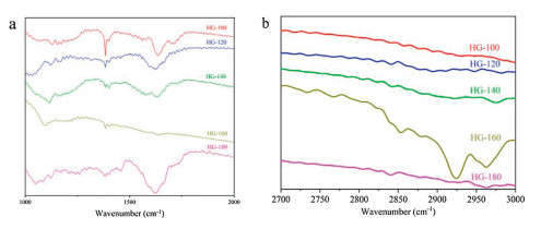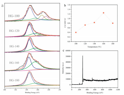 | Fig. 4. (a) High-resolution C 1s peak of HG-100, HG-120, HG-140, HG-160 and HG-180. (b) C-C-H/C=C value of the samples. (c) Wide-range XPS spectra of HG-160. | |