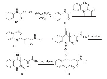 On the basis of the above mentioned results and previous reports [15], a proposed reaction mechanism was described in Scheme 4. First, oxidation of 2-oxo-2-(phenylamino)acetic acid B1 by persulfate generated carbamoyl radical E, subsequently, alkyl radical F was formed via the addition reaction of carbamoyl radical E with N-(2-cyanophenyl)-N-methylmethacrylamide A1. Intramolecular addition of the alkyl radical to the nitrile provided imine radical G, which was converted to imine H via H-abstraction. Finally, the hydrolysis of imine in the presence of H2O could result in the desired product C.