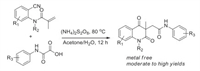 Reactions conducted under metal-free conditions are ecofriendly and play an important role in organic synthesis [12]. As a readily available, environmentally friendly, easily handled oxidant, persulfates have been greatly applied in organic synthesis [13]. Generally speaking, persulfate can decompose to give sulfate radical anions under heating, light irradiation or transition metal reduction conditions. This radical anion has strong single-electron oxidizing properties, and can oxidize various neutral molecules or anions to produce corresponding radical active intermediates. These newly generated reactive intermediates can undergo a series of chemical transformations to give useful compounds with diverse structures. As our continuous efforts on heterocyclic compounds [14], herein, we disclosed ammonium persulfate promoted cyclization of ortho-cyanoarylacrylamides with oxamic acids for the construction of carbamoyl quinoline-2, 4-diones under metal-free conditions (Scheme 1).