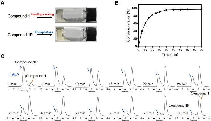 | Fig. 1. (A) The optical images of the hydrogels of 1 and 1P (B) The conversion ratio of 1P catalyzed by the phosphatase at 37 ℃. (C) The detailed enzymatic process at different time points detected by HPLC. | |